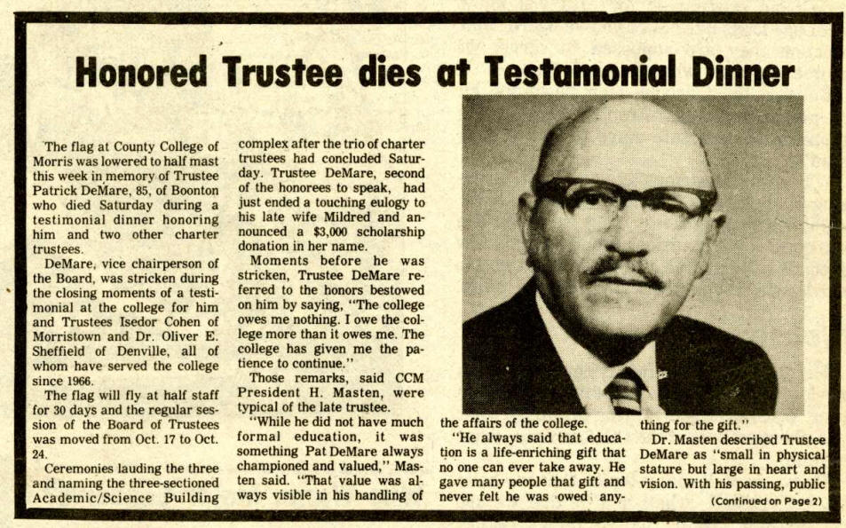 Article in Youngtown Edition about the death of trustee, Patrick DeMare, during a testimonial dinner in October 1979.
