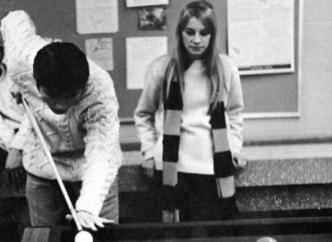 Students playing pool in the recreation room in Henderson hall