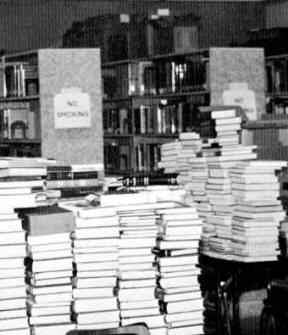Books waiting to be shelved in the new library