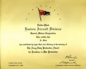 Award for excellence in war production given to Irene Stein on November 8, 1944 in Linden, New Jersey, signed by plant manager and vice-president, General Motors Corporation. Text of award: Linden Plant Eastern Aircraft Division General Motors Corporation. This certifies that I. Stein has contributed by loyal effort and efficiency to the winning of the Army-Navy Production Award for Excellence in War Production. |