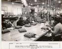 Place "M64A1 Fuze, P.D. Painting threads and assembling booster to body. Note assembling machine on other side of table with operator ready to exchange empty tray for loaded one. (Double line)" Photo caption